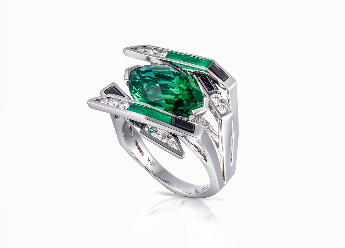 • EMERALD AND DIAMOND PLEAT ART RING