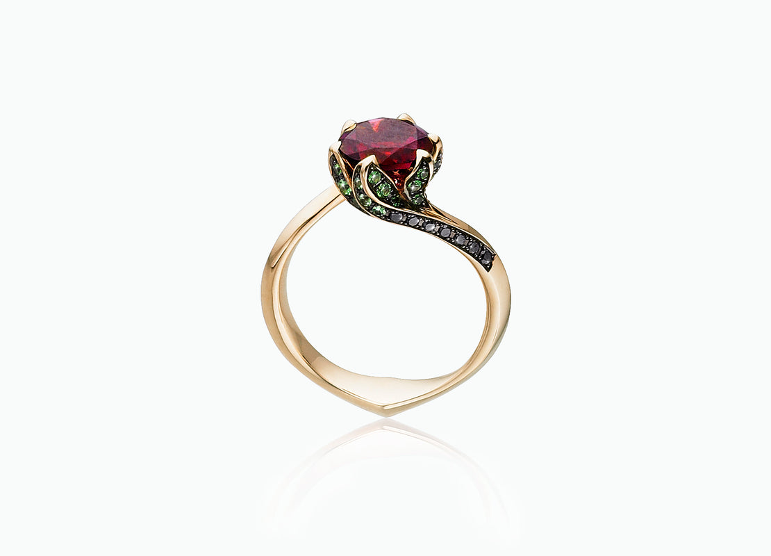 The Lily Pad collection is an ode to old forgotten English gardens and ponds. At the heart of the collection is the rubellite Lily Pad ring, an unusual solitaire in the shape of a gracious enchanted flower.