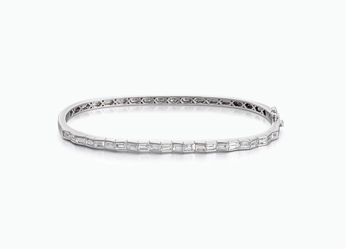 The Huggies and Chevron capsule adds a contemporary edge to jewellery classics. Pendants, bangles and earrings feature rows of sparkling white Diamonds, while stack rings embrace colour with bold Gemstones.