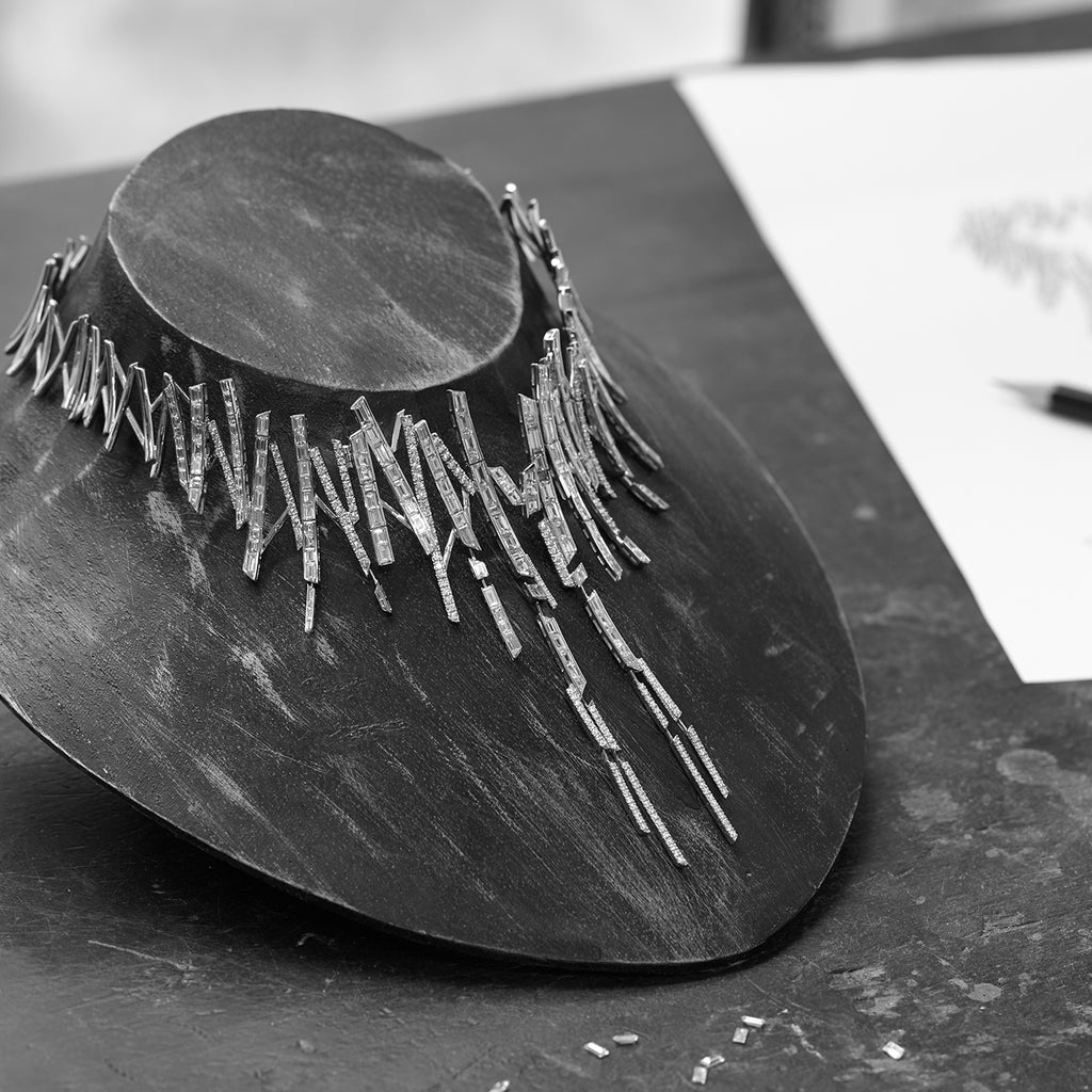 Tomasz designed a necklace blending the boundaries between art and jewellery through his exploration of the diamonds' different facets. The necklace is a burst of bold and confident lines juxtaposed with a gentle glow.